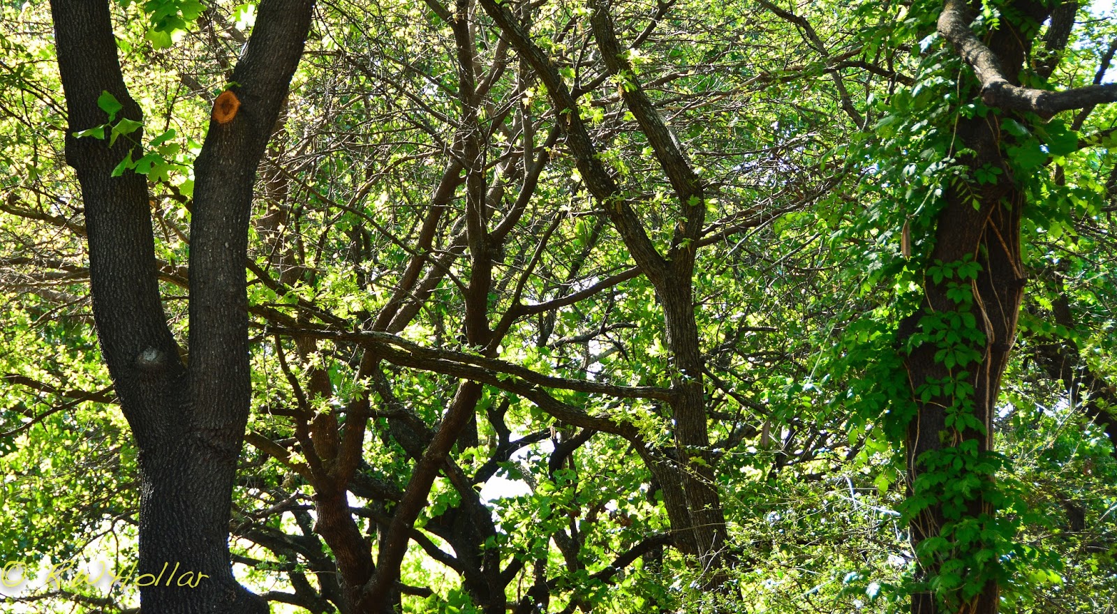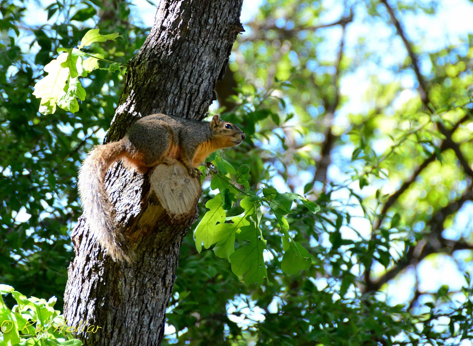 He chatters his way along a crooked, snarled trail of branches and twigs. Up one limb, down another; leaps four feet onto a tiny twig that would hardly hold one of those sparrows. I see panic in his eyes as he is scrabblin’ to land on another more suitable perch. Then he stops. Tail twitchin’, curlin’ and straightening. Off again. In a flurry of furry moves he disappears into that leafy maze – I’m lookin’ at branches movin’ but he’s clean outa sight.