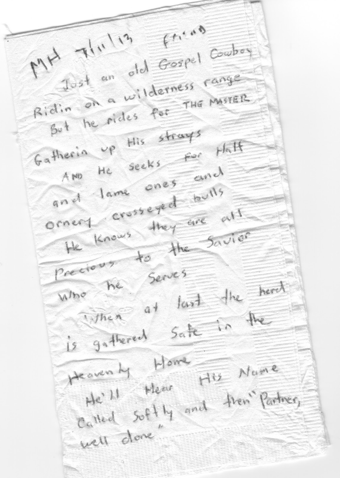 Some time ago I’d been working with some people, former prison inmates and their families; just sharin’ the love of Jesus with them, tryin’ to meet their needs. A man (name’s James Hazlewood) was helping. At some point during the evening’s activities he stepped up to me and shoved a napkin into my hand with some writin’ on it. I put it in my pocket nonchalant like. Later, when I got home, I pulled the napkin outa my pocket and read it. What a blessing. Thanks pard. You’re a blessing.